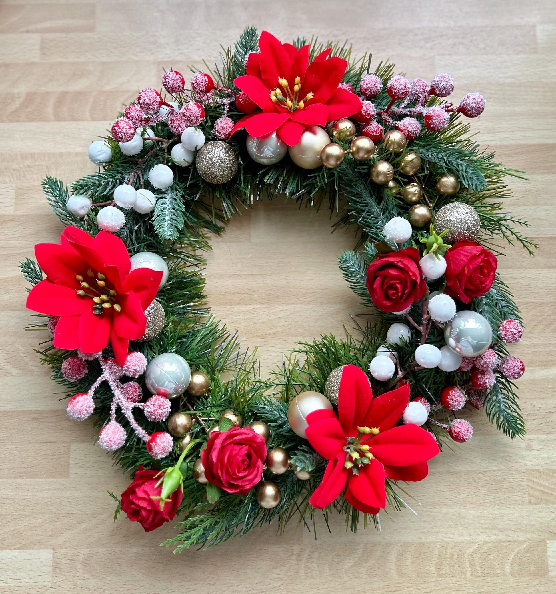 Each wreath is lovingly created using premium artificial materials, featuring lush evergreen foliage, elegant roses, frosted berries, and charming festive accents. The rich combination of gold and vibrant red blooms against fresh greenery creates a timeless, sophisticated look that welcomes guests and spreads holiday cheer.