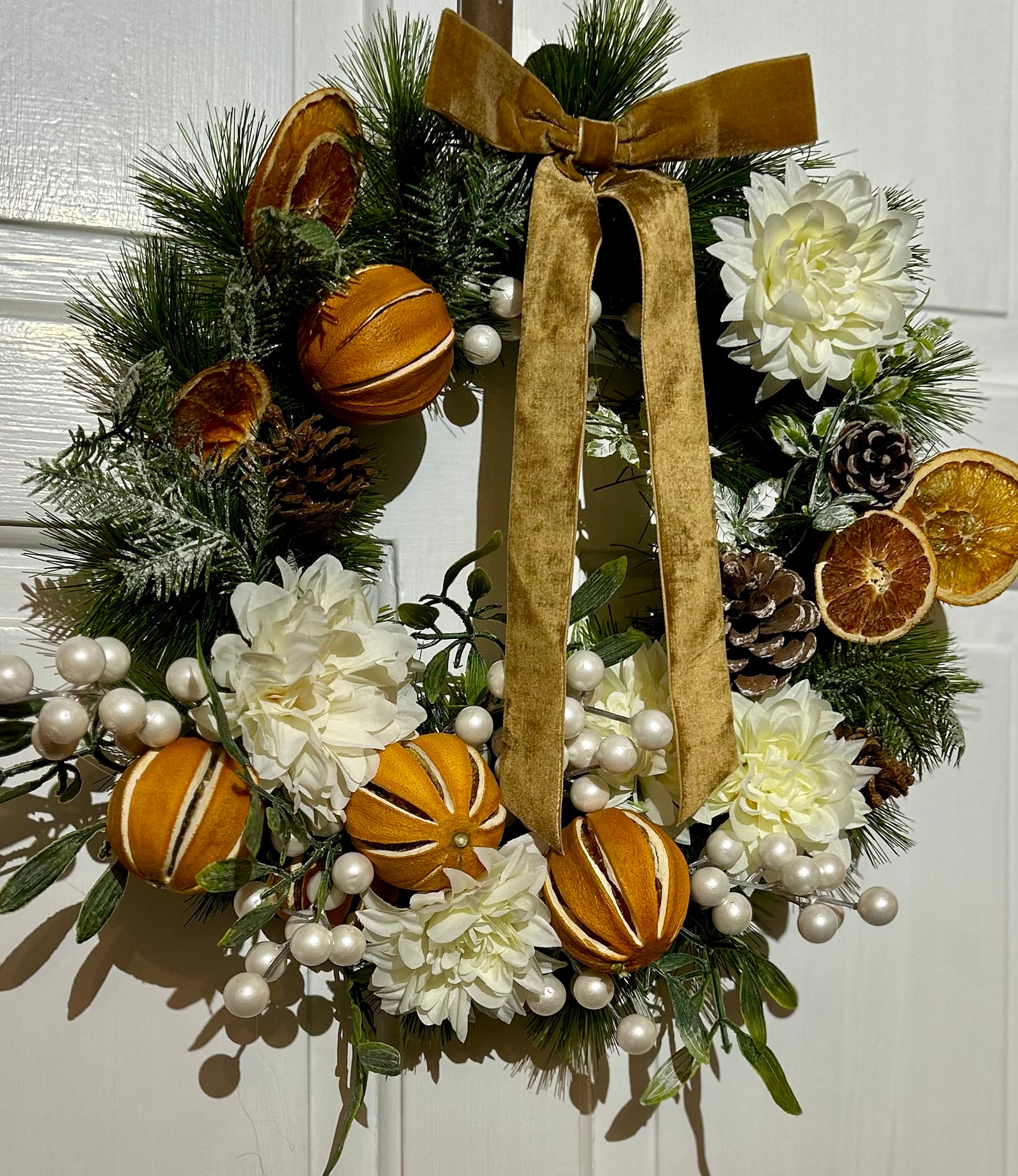 The wreath features an exquisite collection of ivory white dahlia blooms that add soft, romantic texture throughout the arrangement. Dried orange slices and whole dried oranges bring natural warmth and a touch of rustic charm, while natural pine cones provide earthy depth and dimension.