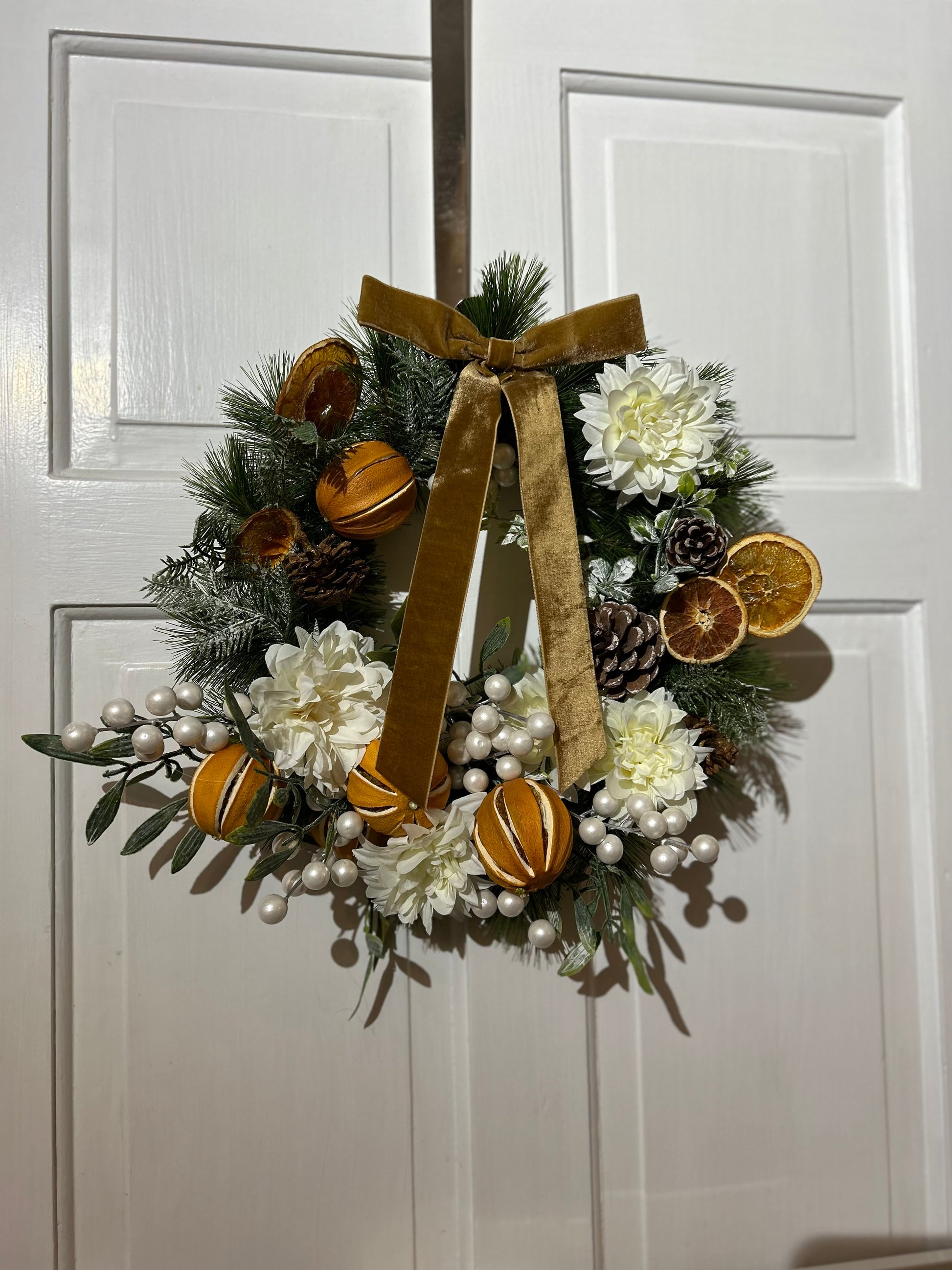 Elegant Gold & White Christmas Wreath with Natural Citrus