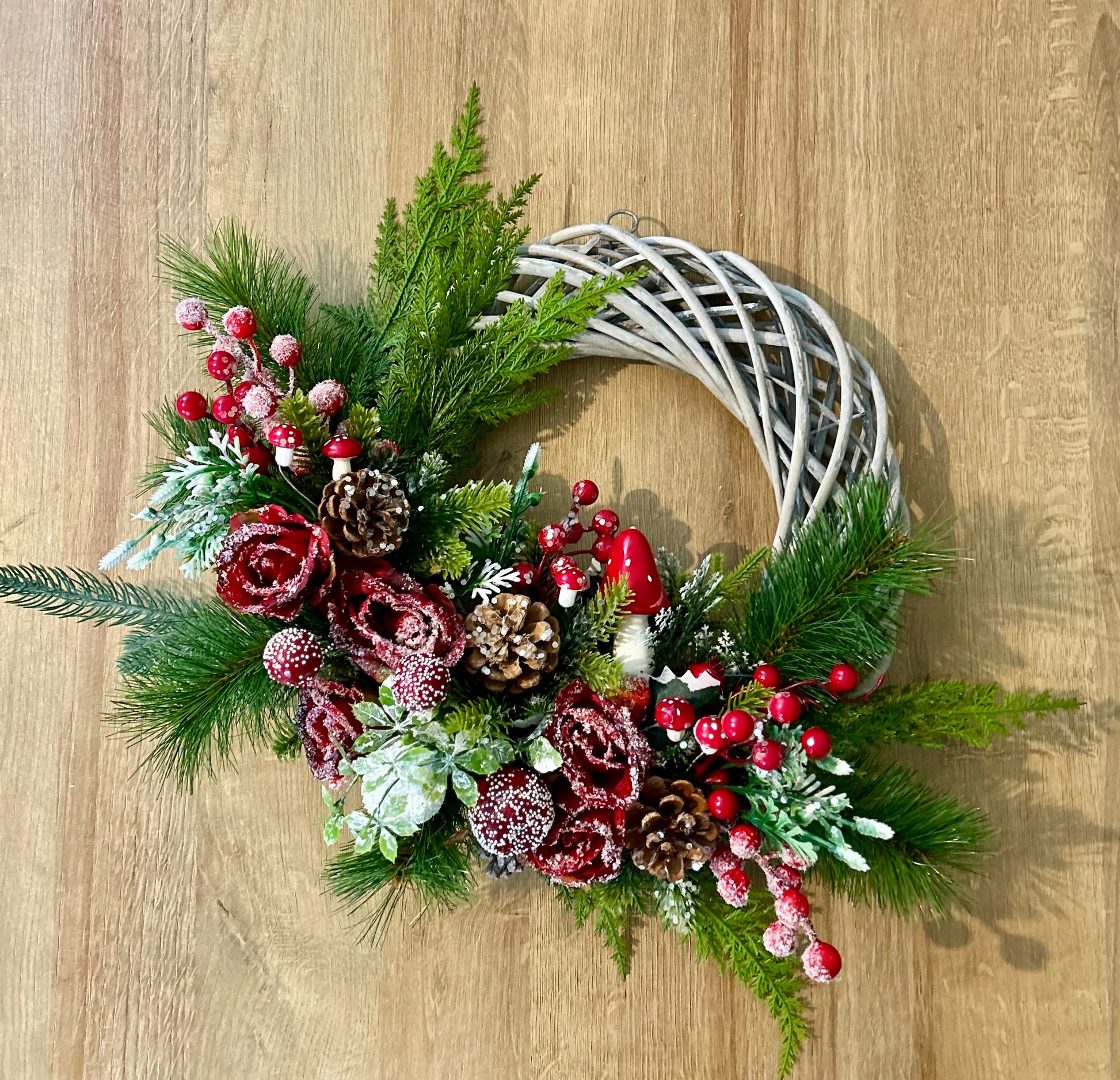 This wreath captures the enchantment of a winter forest with its rich colour palette of deep red, forest green, crisp white, and natural wood tones. The whimsical toadstool accents add a playful, storybook quality that's perfect for creating a magical holiday atmosphere.